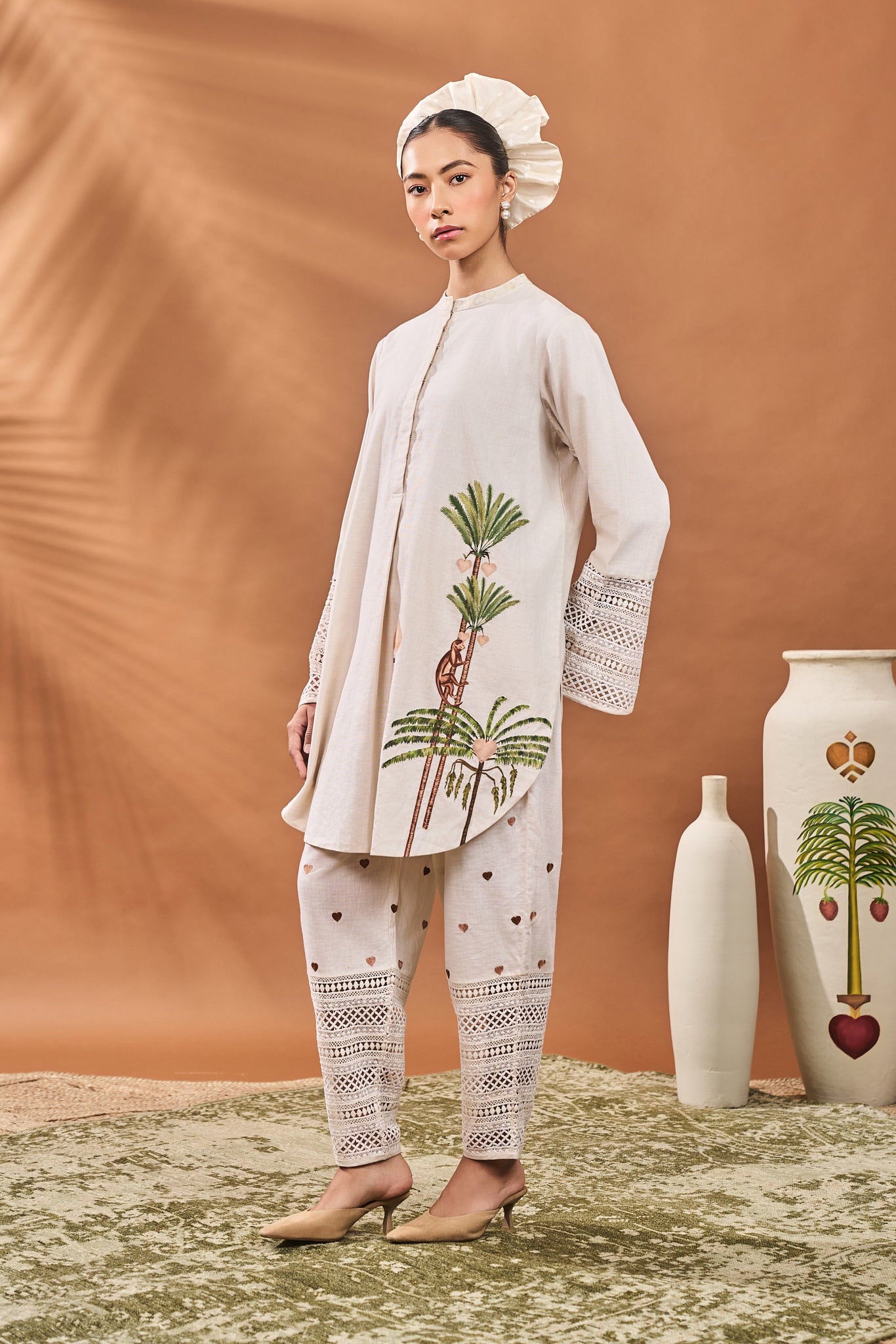 Details: Tunic- All over printed tunic |A-line| 'V' neckline and sleeves hem adorned with hand embroidery Pant- Green straight pants | Side seam closure
