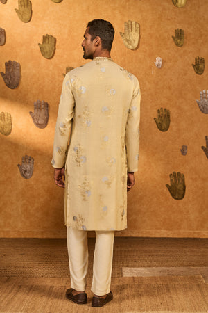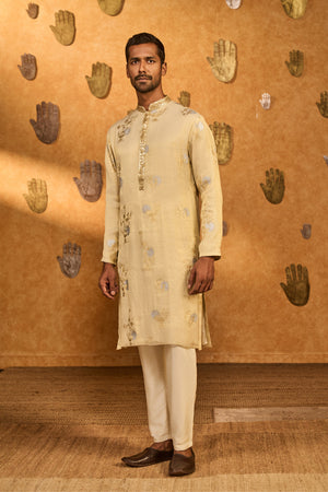 Details: Kurta- All over foil printed kurta | Full sleeves |Mandarin collar | Pocket detail | Concealed placket with gold embroidery Pant- Straight pants with pocket