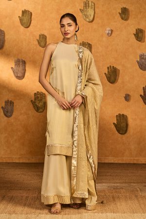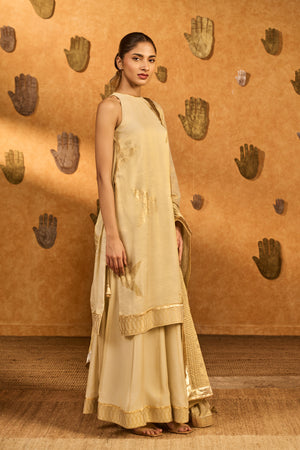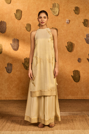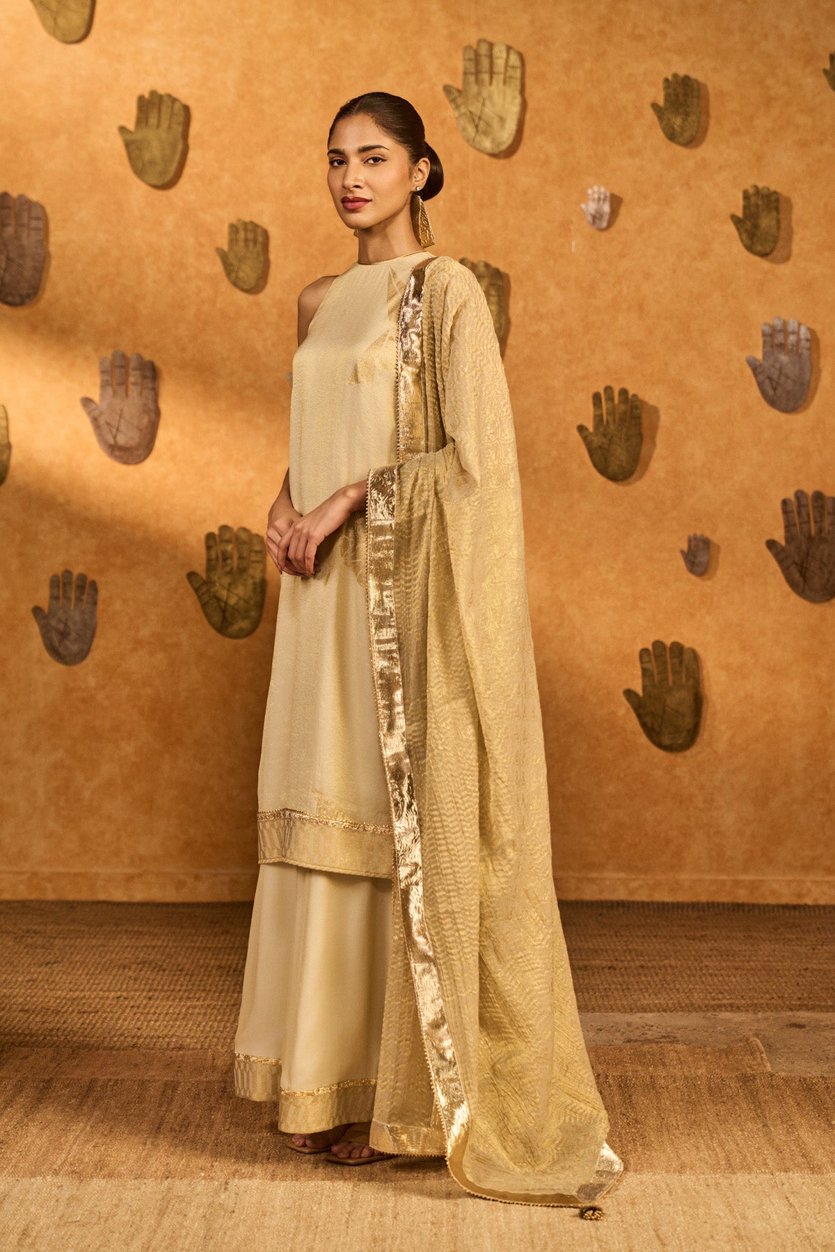 Details: Kurta- Straight kurta adorned with Paper Breeze placement foil print | Halter neckline | Center back opening| Adorned with embroidered borders and gold gota | Embellished with tassles at the side seam | Pinstripes print border backing detail Sharara- Sharara adorned with foil print and embroidered borders | Side Seam Opening | Pinstripes print border backing detail Dupatta- Printed organza crushed dupatta | Embellished with kinari gota and foil printed borders | Pinstripes print border backing detail