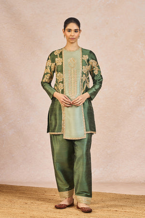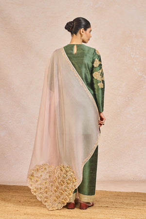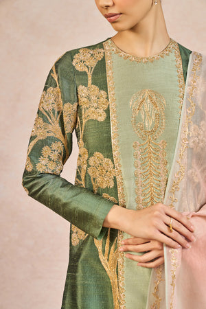 Description: This elegant ensemble features a deep green kurta elevated with a sage green patch delicately adorned with intricate hand embroidery in Vrksh Sitara and Kashmiri Kali motif, creating a subtle yet striking interplay of tones. The contrast adds a layer of refined depth to the silhouette, highlighting the craftsmanship in every detail. Paired with coordinated bottoms, the look is completed with a soft pink organza dupatta, exquisitely finished with artisanal cutwork and delicate hand embroidered Paan Phool motif. The ethereal dupatta drapes gracefully, adding a touch of softness and festive charm. A perfect confluence of earthy elegance and feminine flair, this ensemble is crafted for celebrations steeped in tradition and beauty.