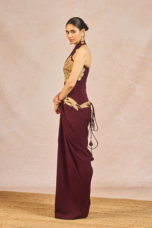 Description: ‘KAREEB SE’ fusion set is where traditional artistry meets modern silhouette, this striking ensemble features a structured corset with an attached embroidered scarf, brought to life with intricate gold sitara, dori, and zardozi work. Inspired by our Vrksh Sitara motif, the corset is paired with a fluid draped skirt that moves with effortless grace. The true showstopper is the embroidered scarf, adorned with our Kolar Mocha motif and finished with delicate crystal tassels. Perfect for weddings, festive soirées, or statement moments this look is a seamless blend of old-world craftsmanship and contemporary glamour.