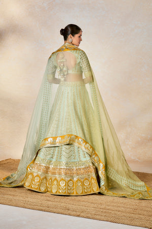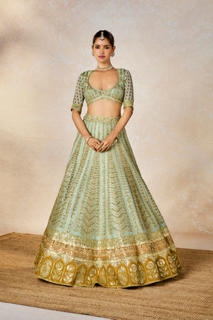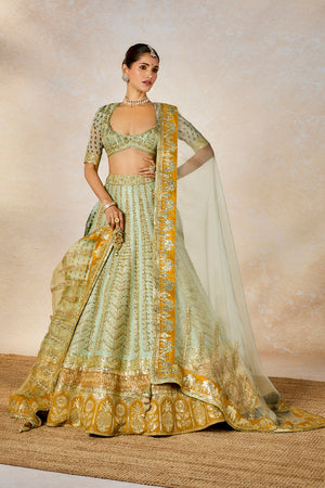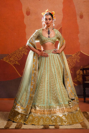 Details: Description: The Kashni lehenga is a sage green heavily embelished lehenga set on a silk background with motifs inspired by 'Amaltas', 'Sehra' realized through sitara and moti embroidery. Finished with a contrast ochre border that adds some whimsy, this is for the bride who prefers subtle glamour whilst remaining true to her traditional roots.
