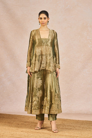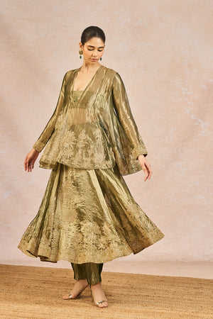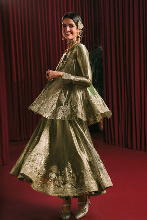 Description: The ‘KHWABON KI SHEHZADI’ SKD SET is a stunning display of refined elegance and intricate craftsmanship. Entirely crafted from delicate tissue fabric, the ensemble is richly adorned with detailed gold embroidery including the ' Gul Jharokha' motifs repeated in a rhythmic circular repeat, adding a layer of texture and opulence. The set includes a sheer kurta, a structured tube top, a skirt, and tailored pants—each piece thoughtfully designed to create a harmonious and glamorous silhouette. The interplay of fluid layers and metallic detailing makes this set a perfect blend of tradition and contemporary flair.