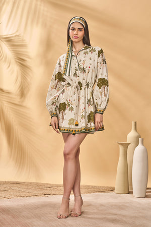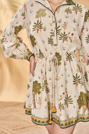 Details: Fit and flare mini dress | Popover placket with one-piece collar | Adjustable tie-up at the waist with tassels attached | Peasant sleeves | Cuff closure with shell buttons