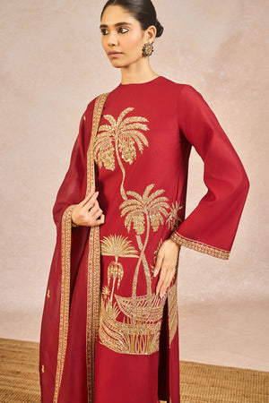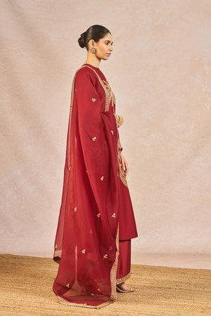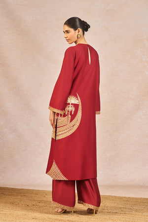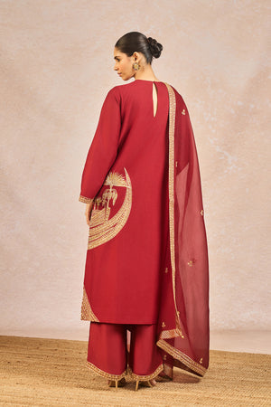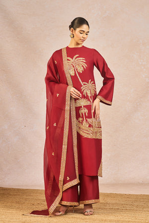 Description: The Chand Kinara kurta set is a striking celebration of traditional artistry in a rich cranberry red silk base. Intricately hand-embroidered with our signature Chaand Kashti motif, the kurta features bold embroidered patches on both front and back, making it a true statement piece. Embroidered accents on the sleeves and hem add a sense of balance and detail. It is paired with straight-fit silk pants and a lightweight organza dupatta, delicately scattered with gold bootis and edged with an embroidered border. A refined ensemble that blends storytelling with elegance—perfect for occasions where every thread speaks of heritage.