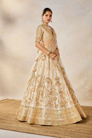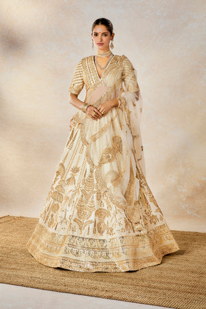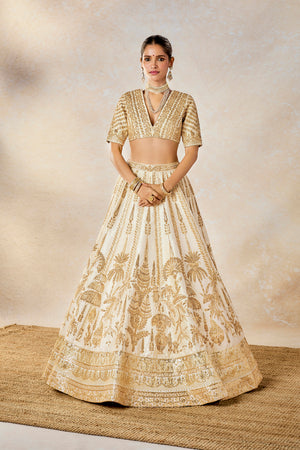 Description:A work of meticulous craftsmanship, this cream-hued silk lehenga brings alive imageries of a tropical rainforest encrusted in gold. Through works of our signature technique of zardozi and moti work, this ensemble represents the soothing yet traditional bride. It is paired with a deep V-neck blouse and a dupatta which has a scallop border with our motifs scattered across the length of it. It could also be paired with our beautiful optional veil embellished with 'Raj pankh' motif gold embroidery.