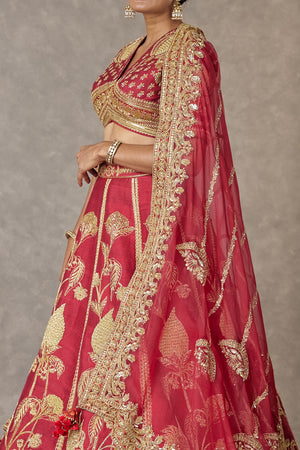 Details: Maroon 'Anar-Phool' Lehenga Set- Lehenga adorned with embroidery with dabka, sitara & dori kaam | edged with kinari |Pocket detail | Side zip closure | Comes with a separate Can Can skirt Blouse- 'V' neckline | Elbow sleeves | Adorned with embroidery with dori, sequins & dabka kaam |Center back opening with tie-up tassel detail | Printed lining Dupatta- Organza dupatta embroidered with sequins |Printed backing |Tassel detail