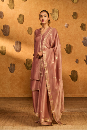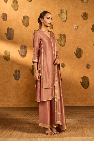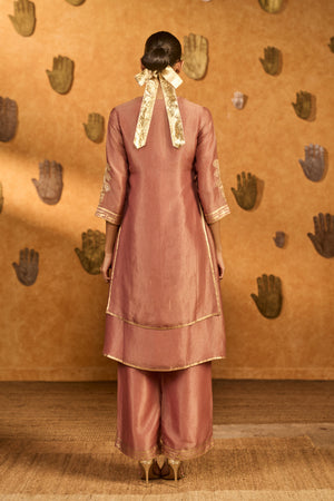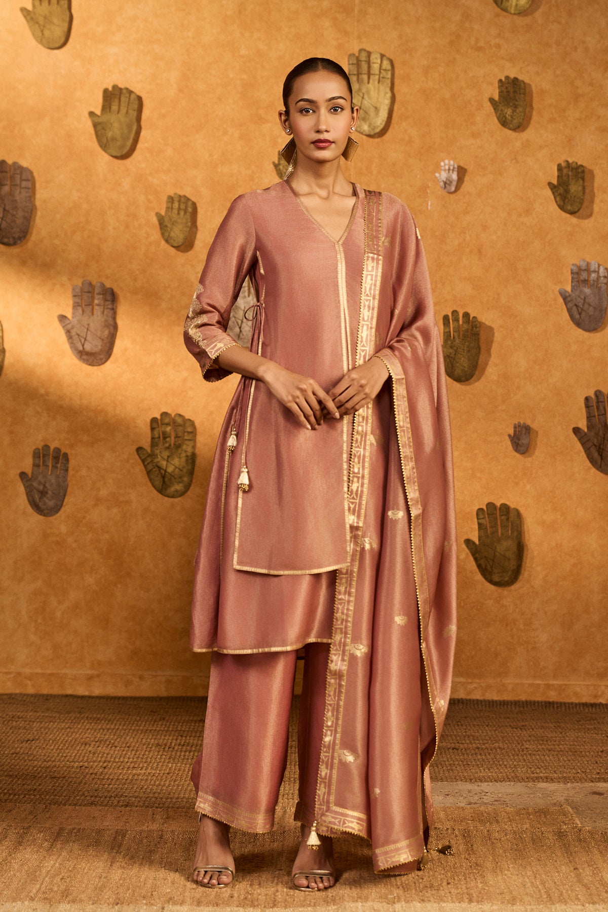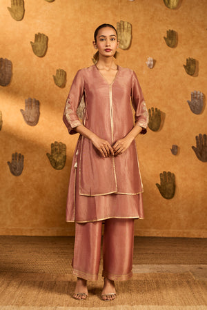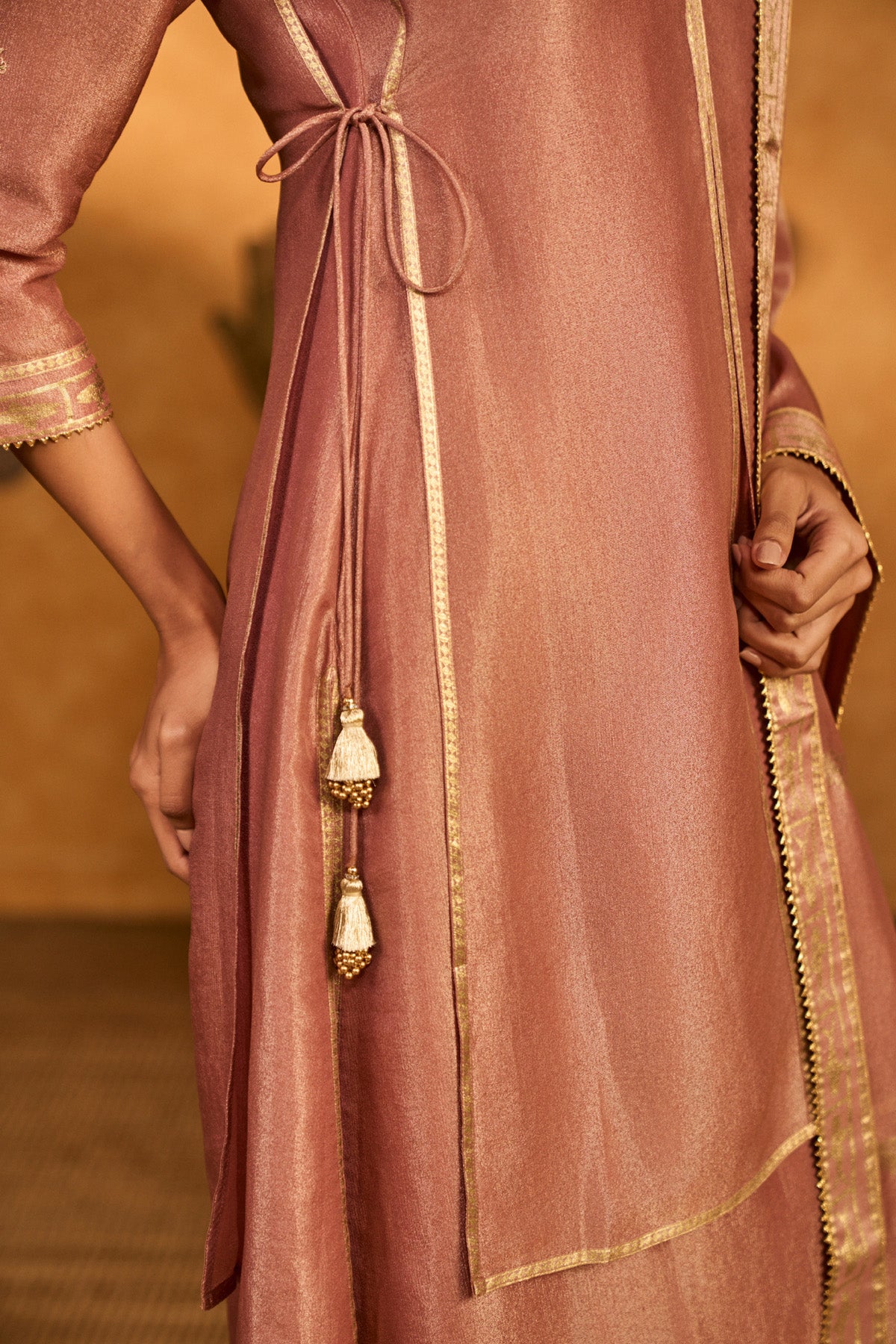 Details: Kurta- Layered A- line kurta with V- neckline and sleeves embellished with beautiful gold embroidery | Kurta is adorned with foil printed borders | Comes with dori at the side seam with tassles Pant- Mauve Straight pants adorned with foil printed borders and kinari gota | Side Seam Closure Dupatta- Printed tissue dupatta | Embellished with kinari gota and foil printed borders | Comes with Tassels