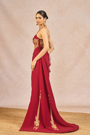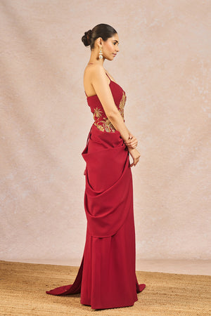 Details: Gown - The 'Dhadkan' Gown- Embroidered corset body | Sweetheart Neckline | Asymmetrical cowl drape | Side trail with embroidered 'Mithi Makaai' motif placement | Peep bra construction detail | Halter strap with criss-cross detail at the back | Riveted and zipper closure at the back
