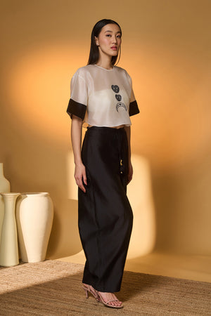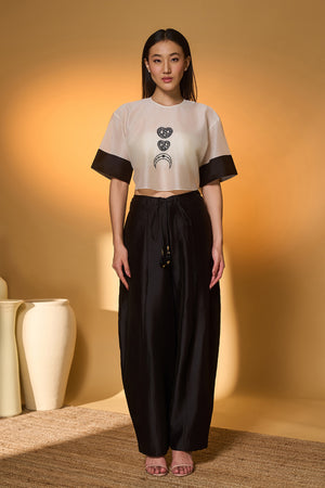 Details: T-shirt Top- Relaxed silhouette | Drop-shoulder | 'Midnight Snack' embroidered on body | Contrast Patti detail on sleeves Barrel pants- Faux-double waistband detail with tie-up detail adorned with tassels | Barrel leg silhouette