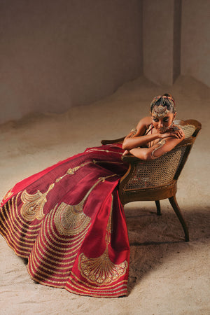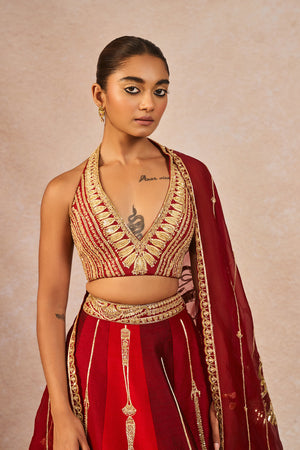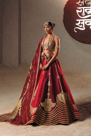 Description: This stunning 'Milan Ki Aas' Lehenga in a rich son red tone features elegant fan-shaped motifs of varying lengths, richly adorned with heavy gold embroidery that adds depth and opulence to the flowing silhouette. Paired with a chic halter-neck blouse, also embellished with intricate gold work, the ensemble beautifully blends contemporary style with traditional grandeur. The matching dupatta is delicately finished with heavily embroidered fan-shaped motifs along the edging, perfectly tying the look together with striking, regal detail—ideal for festive occasions and weddings.