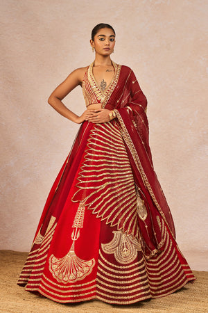 Details: The 'Milan Ki Aas' Lehenga Set- Lehenga intricately embroidered with 'Pankha' motifs in a linear pattern |Striped scallop embroidery along the hem | 12 Kalis | Side Seam zipper closure | Side pockets | Comes with a separate Can Can skirt. Blouse- Halter neckline | Open back detail | Centre back closure. Dupatta - Red organza dupatta with enlarged 'Pankha' motif placement along the hem | Delicate embroidered stripes and buttis all over.