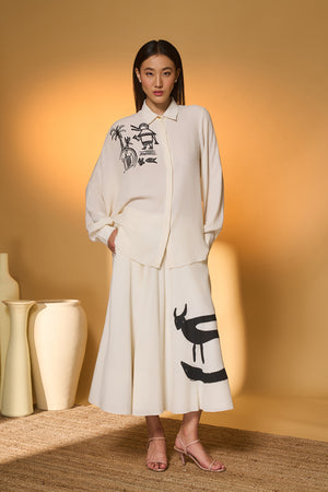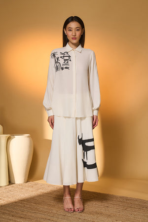 Details: Shirt- One side Batwing sleeves | Front closure | Turtle dream placement print on the right shoulder Skirt- A circular swing skirt |Placement screen printed "Moo Meadow" | Side zipper