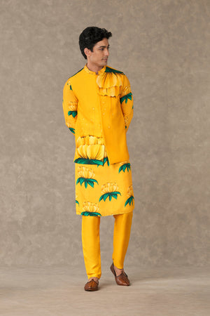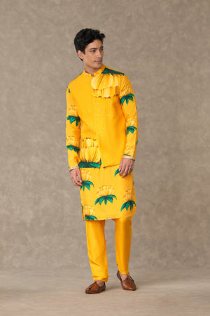 Details: Mustard Masakali Set - Digital placement printed Bandi | Mandarin collar embellished with embroidered border | Concealed placket |Center front opening |Printed lining Kurta- All over digital printed kurta with full sleeves |Collar, placket and sleeve hem embellished with border |Pocket detail|Concealed placket|Mandarin collar Pant- Straight pants with pocket.
