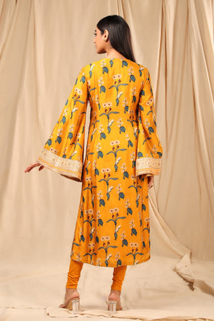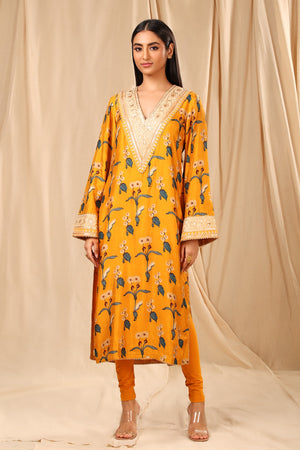 Details: Mustard Spring Blossom Kurta - Pick this Mustard Raw Silk kurta with V-neck to dazzle at a special occasion! Embellished with embroidered borders, the outfit features bell sleeves and side slits. The kurta has a beautiful Spring Blossom print and comes with a Mustard Legging.