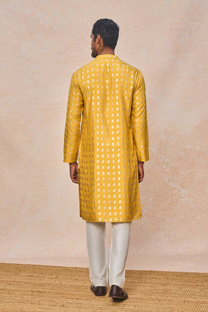 Styling: Pair Mustard Color Kurta Set for Men with a pair of mojris.