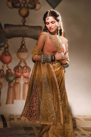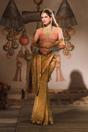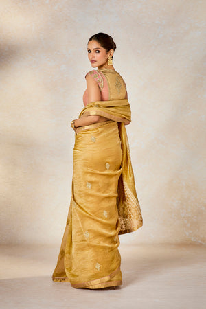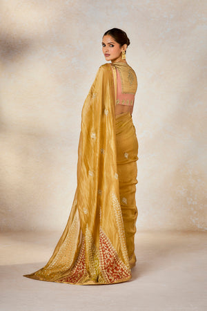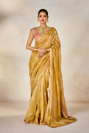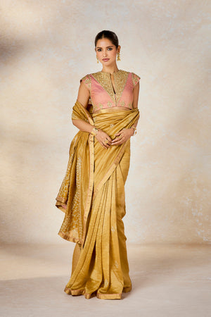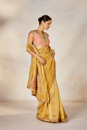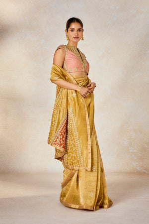 Description:Designed in silk tissue, for the bride who embraces tradition with a side of her own style The Mysore Pak Saree with multicolored patchwork embellished in pale gold. Paired with a soft pink blouse with dori and sequins work in a timeless classic silhouette, this saree is a perfect addition to a bride's heirloom.