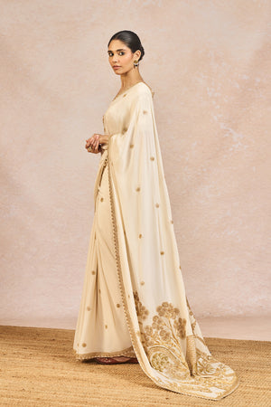 Description: The ‘NAMKEEN’ SAREE beautifully blends traditional artistry and elegant design, featuring intricate Sitara and dori embroidery that highlights ' Gul Jharokha' motif, including exquisite bagh motifs, across the fabric. The pallu stands out with richly embroidered motifs, showcasing exquisite threadwork that adds depth and richness to the design. Complementing the saree is a matching blouse crafted from the same crepe fabric, adorned with delicate gold embroidery on the sleeves and neckline, echoing the saree’s motifs for a cohesive and elegant look. Known for its fluidity and softness, the crepe fabric drapes effortlessly, enhancing the wearer’s silhouette with graceful ease.