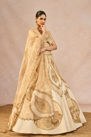 Description: This elegant 'Noor Ban Gaye' Lehenga is adorned with intricate bagh motifs brought to life through detailed moti work, sitara kaam, and delicate cutdana embroidery in rich gold tones. The design features prominent circular tissue patches with 'Chaand Kashti' & 'Dil Chithra' motifs, adding depth and grandeur. Paired with a uniquely styled two-piece blouse that forms a cohesive silhouette, the ensemble is complemented by two dupattas—both in ivory organza with gold tissue —both heavily embroidered with matching motifs and finished with scalloped hemming. The look blends regal tradition with modern finesse, making it perfect for statement occasions.