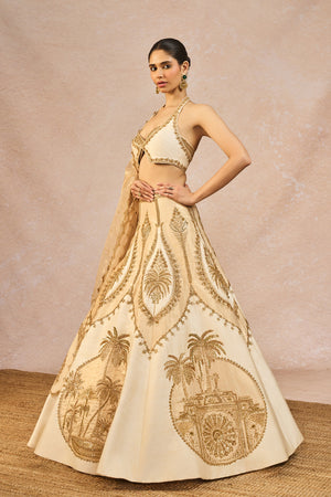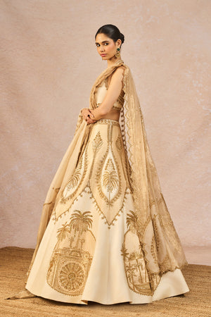 Details: The 'Noor Ban Gaye' Lehenga Set- Ivory Lehenga intricately embroidered with circular tissue patchwork | Each circle alternates of 'Chaand Kashti' & 'Dil Chithra' motifs | 6 Kalis | Side Seam zipper closure | Side pockets | Comes with a separate Can Can skirt, Blouse- Halter neckline | Double layered blouse | Centre back closure. Dupatta 1- Delicate Ivory organza dupatta with 'Gul Jharokha' motif embroidered on tissue patchwork |Dainty butti embroidery all-over| Scallop Border. Dupatta 2- Tissue duppata with 'Gul Jharoka' motif embroidered patchwork | Embroidered buttis all over.