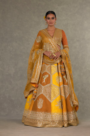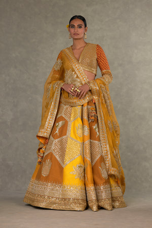 Details: This Ochre Sorbet Neel Kamal Lehenga comes in not one but 3 shades of yellows- Surajmukhi, Sona and Khaakhi |Adorned with Son-chidiya, Neel-Kamal, Haathphool & Jaali motif and embroidered in dori, sitara & moti kaam |Hem is beautifully embellished with embroidered borders and edged with kinari | Side zip closure | Pocket detail| Comes with a separate Can Can skirt Blouse- Blouse Adorned with 'Trikone' embroidery in dori, sitara & moti kaam wiht centre front closure | 'V' Neckline| Patchwork full sleeves with a mix of digital print and embroidered borders and edged with kianri along with zip closure | Printed lining Dupatta- Organza dupatta with Neel-Kamal embroidery all over in dori, sitara and moti kaam| Embellished with embroidred border and edged with kinari | Tassel detail Bustier- All over digital printed bustier| Halter neck with centre back closure | Adorned with a variety of stones
