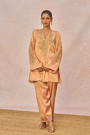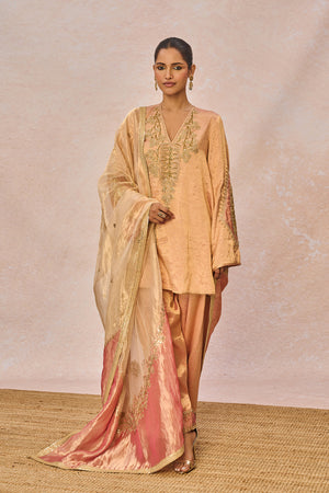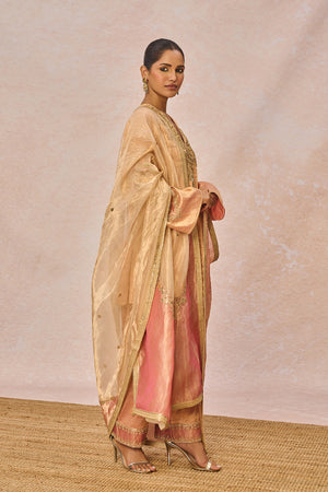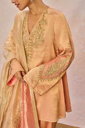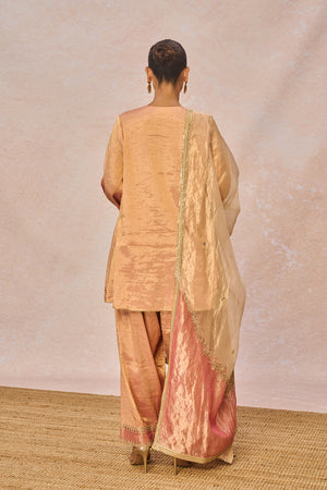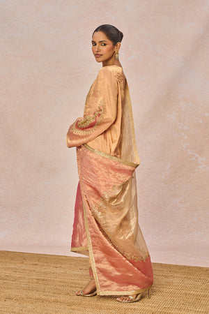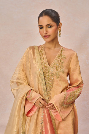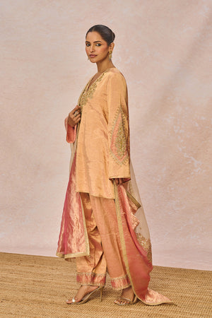 Description: ‘PATAKHA’ SKD SET is a refined ode to timeless elegance, blending intricate craftsmanship with modern sophistication. Crafted in luxurious tissue fabric with a subtle gold touch, the kurta features intricate embroidery highlighted with the signature Phool Bagh motif, symbolizing blooming grace and heritage artistry. The sleeves are adorned with elegant tissue patchwork, adding a hint of contemporary charm to the traditional silhouette. Paired with matching pants detailed with fine accents, the ensemble is completed with a tissue dupatta featuring a gold border and delicate embroidery, lending a luminous, festive allure—perfect for celebratory occasions and intimate gatherings.