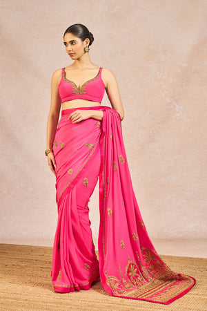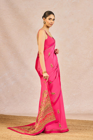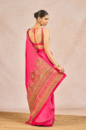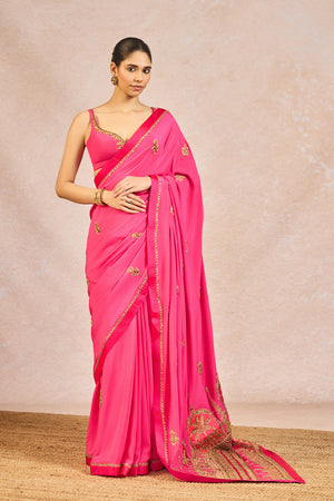 Description: This vibrant saree, crafted in rich tones of pink, exudes timeless elegance with delicate golden floral buti embroidery scattered across the drape. The ensemble is framed with a finely detailed border featuring traditional motifs, reminiscent of intricate jharokha patterns, and is meticulously finished with shimmering dori and sitara kaam. The palla flows gracefully, its hem richly embroidered to create a dramatic and regal trail that adds movement and grandeur. Paired with the saree is a coordinated blouse in matching pink, hand-embroidered with fine golden threadwork along the neckline and straps, offering a subtle yet striking contrast.