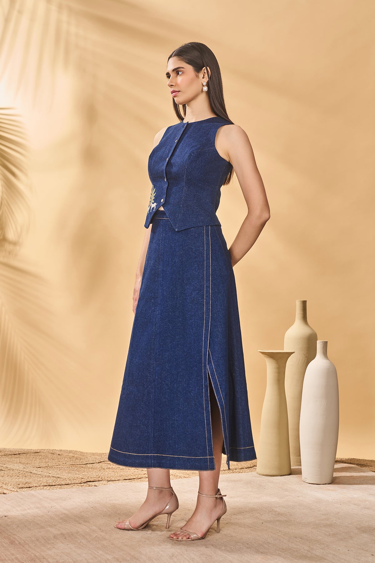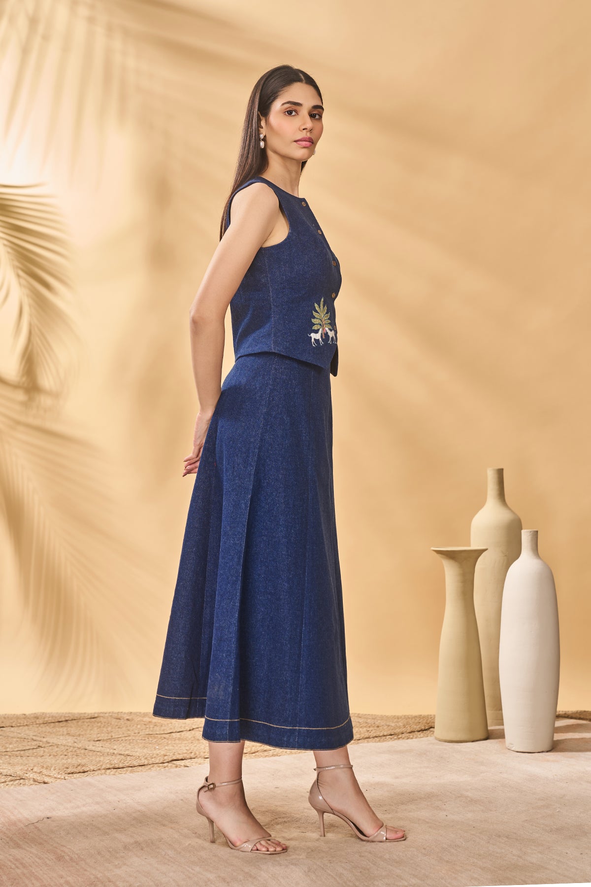 Details: Waistcoat- Round neck | Front button closure | Paw-tree patchwork on front Skirt- A-line | Side slit | Stitch detail along the hem