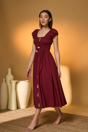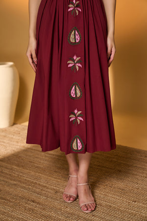 Details: Fit and Flare Silhouette | Split Square Neckline with tie-up detail |Tie-up adorned with tassels | Embroidered 'Pear of Tropics' Front Panel | Flowy Silhouette | Gathered half sleeves
