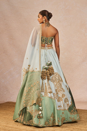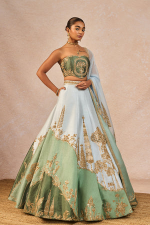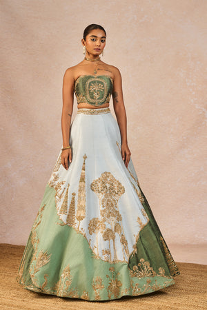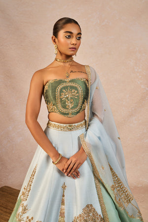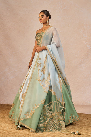 Details: The 'Pehli Baarish' Lehenga Set- Lehenga intricately embroidered on asymmetrical abstract patchwork with 'Bagh' motifs in a linear pattern | 12 Kalis | Side Seam zipper closure | Side pockets | Comes with a separate Can Can skirt. Blouse- Strapless | Embroiderd Corset Body | Open back with tie-up detail | Centre back closure. Dupatta - Sheer green organza with light blue Patchwork Dupatta with enlarged 'Pankha' motif placement on the corners | Delicate linear 'bagh' motifs embroidered all over.