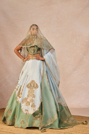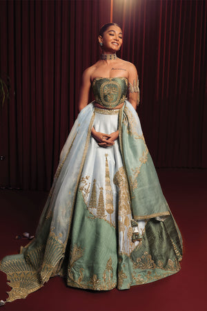 Description: This 'Pehli Baarish' Lehenga inspired by the silhouette of mountains, adorned with intricate Bagh motifs in Moti work, Sitara kaam, and Cutdana embroidery. The structured panels mirror natural mountain peaks, featuring a prominent Chaand motif. Paired with a matching corset blouse and a sheer organza dupatta with patchwork organzas finished with scalloped hemming of the fan shaped motif, this looks merges nature and tradition in a contemporary silhouette.