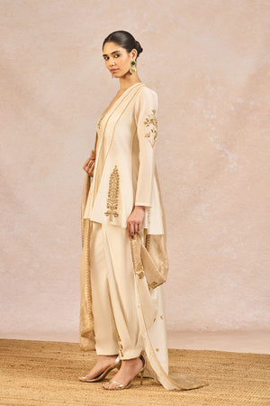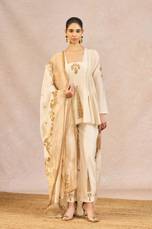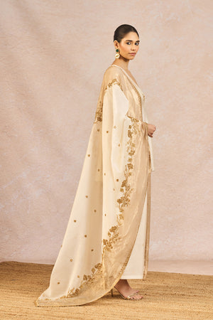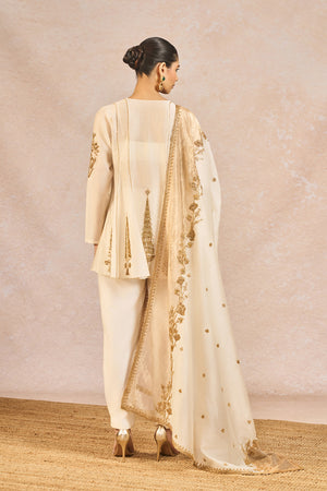 Description: The ‘PEHLI KIRAN’ SET is beautifully adorned with intricate cutdana, Sitara, and gold moti work, adding refined texture and artisanal detail to the fabric. The embroidery features the "Kashmiri Kali "motifs rendered with meticulous precision, introducing structure and elegance to the traditional silhouette. Rich in craftsmanship yet effortlessly graceful, this ensemble is a perfect blend of timeless artistry and contemporary design.