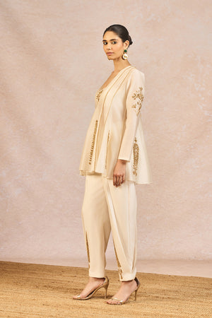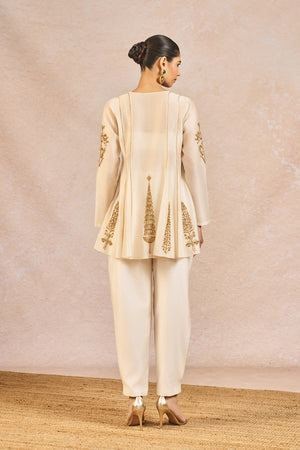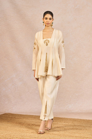 Details: The ‘PEHLI KIRAN’ Set | Tube - Sleeveless | Adjustable Straps| Centre back closure| Kurta - Intricately embroidered with 'Kashmiri Kali' motif| 10 kali | Slightly Transparent| Full Sleeves | Deep V Neckline | Flared Fit | Pant - Carrot Pants| Side Seam Zipper Closure| Side pockets