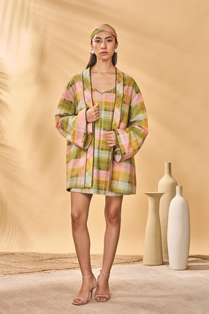 Details: Kimono Jacket | Bead work on hemline of the sleeves| Holiday Home Patchwork on the back | Contrast piping along the front opening Straight slip dress | V-neck | Adjustable strap | Bead work along the neckline