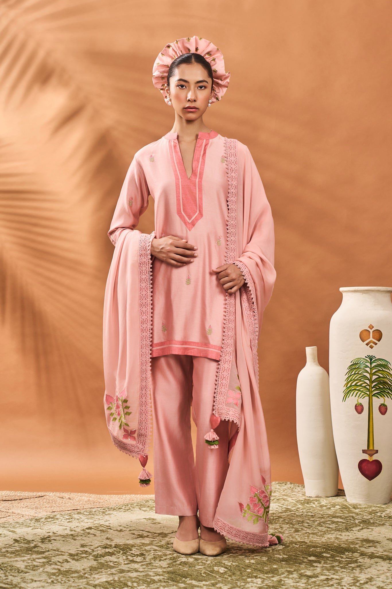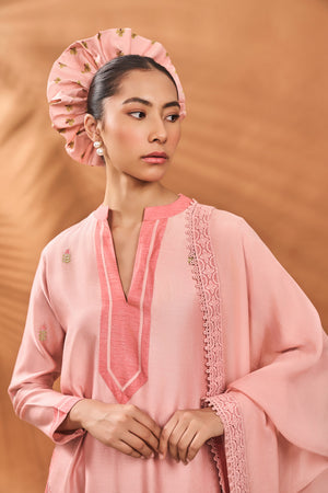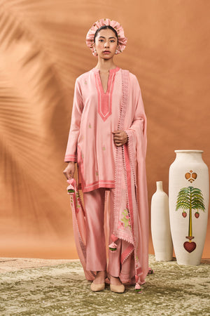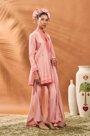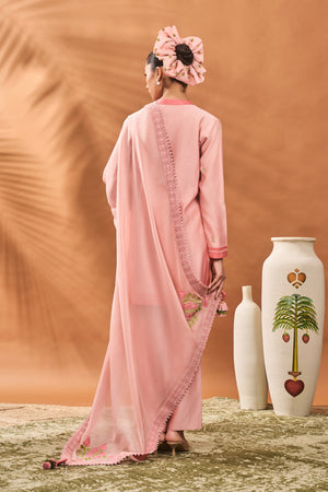 Details: Kurta- Short kurta adorned with beautiful resham and poth embroidery | Mandarin Collar and Sleeves embelliahed with dark tone fabric border Pant- Pink straight pants | Side seam closure Dupatta- Organza dupatta adorned with resham and poth embroidery at four ends| Embellished with crochet border and tassles