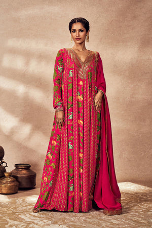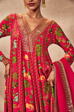 Details: Anarkali- All over digitally printed Anarkali | Full sleeves | 'V' neckline and sleeves embellished with embroidered borders | Side seam opening Dupatta- Organza Dupatta embellished with embroidered border and edged with kinari | Printed border backing