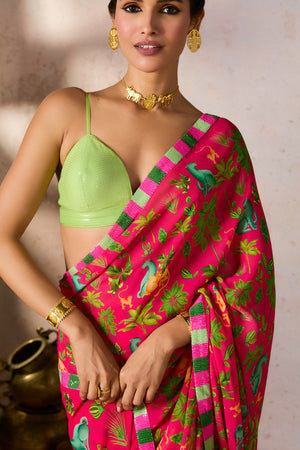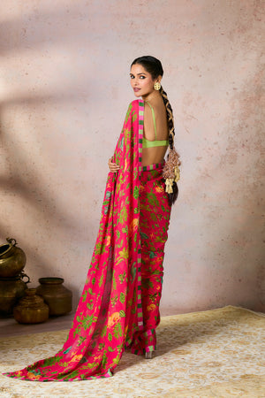 Details: Saree- Beautiful sheer Pink Tropical Rhapsody print saree | Embellished with color block sequins border.