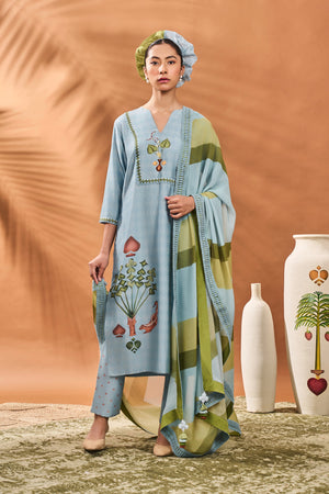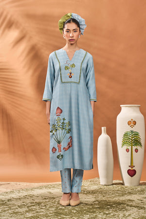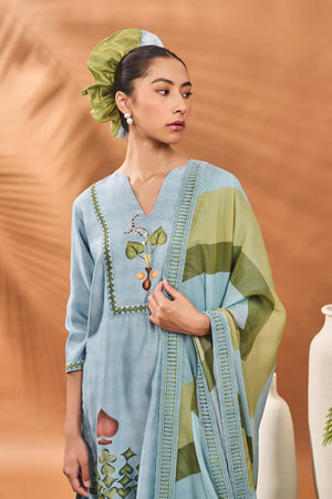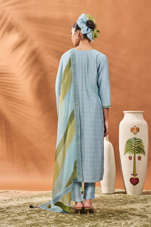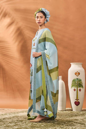Details: Kurta- Digital placement printed straight kurta embellished with printed border around neckline and print applique | Calf Length | Caftan neckline | Sleeves adorned with printed border | Side Seam Opening Pant- Powder Blue all over printed straight pants | Side seam closure Dupatta- Printed organza dupatta | Embellished with crochet border and tassles