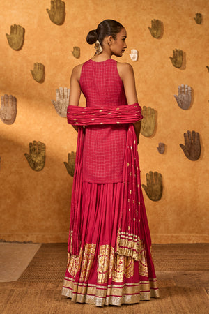Details: A vibrant raspberry zari checks short kurta, highlighted with a whimsical wishdrop foil print and side slits adorned with delicate dori and tassel details. Paired with a flowing skirt featuring a repeated moonfish print arranged in a captivating circular pattern, complete with a sleek zipper closure. The ensemble is finished with a raspberry heartbeat foil dupatta, tying together artistry and elegance.