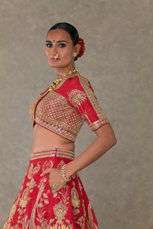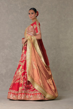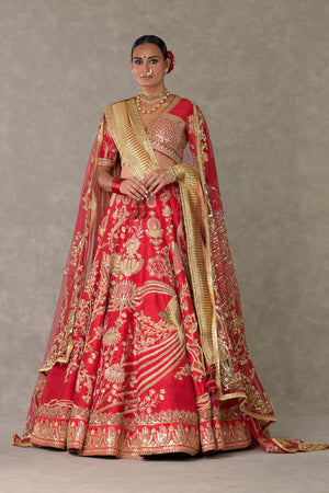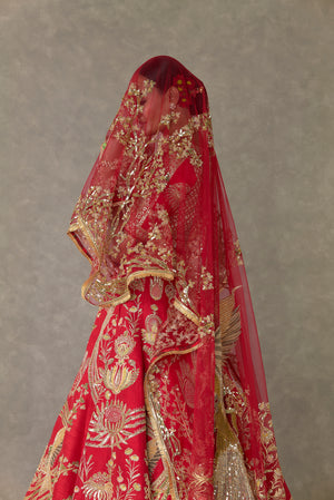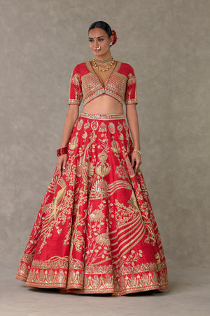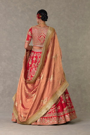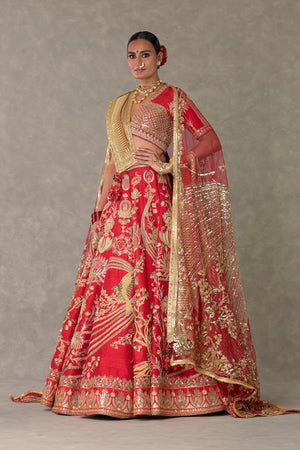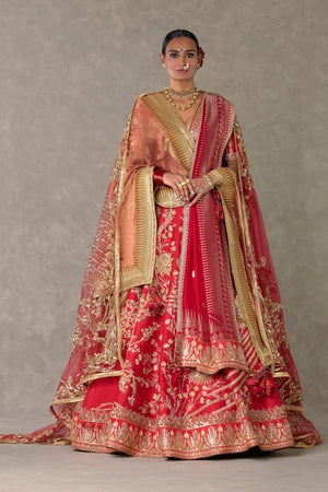 Details: Lehenga- Red lehenga for wedding adorned with multi motifs such as Son-chidiya, Haath-Phool, Neel-Kamal, Shajara in dori, multi coloured thread, sitara & moti kaam |Hemline embellished with embroidered Haathphool border and edged with kinari | Pocket detail | Comes with a separate Can Can skirt Blouse- Blouse adorned with dori, multi coloured thread, sitara and moti kaam | 'V' neckline | Elbow sleeves | Printed lining Brocade Dupatta- Brocade dupatta woven in our signature 'Haath-Phool' border and anar buti all over |Embellished with embroidered border and edged with kinari | Tassel Detail Tissue Dupatta- Gold Foil printed tissue dupatta embellished with embroidered border and edged with kinari | Tassel Detail Dupatta- Embroidered Red tulle trail with our signature Sonchidiya & Shajara motifs in dori, sitara kaam | Edged with jhallar Trail dupatta- Embroidered Red tulle trail with our signature Sonchidiya & Shajara motifs in dori, sitara kaam | Edged with jhallar