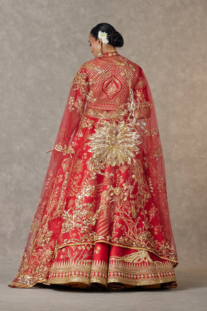 Details: Red Bagh-E-Bahar Neelkamal Lehenga- Lehenga adorned with multi motifs such as Haath-phool, Neel-Kamal, Shajara in dori, multi coloured thread, sitara & moti kaam |Hemline embellished with embroidered Haathphool border and edged with kinari | Pocket detail | Comes with a separate Can Can skirt Blouse- Blouse adorned with dori, multi coloured thread, sitara and moti kaam | 'V' neckline | Elbow sleeves | Printed lining Brocade Dupatta- Brocade dupatta woven in our signature 'Haath-Phool' border and anar buti all over |Embellished with embroidered border and edged with kinari | Tassel Detail Tissue Dupatta- Gold Foil printed tissue dupatta embellished with embroidered border and edged with kinari | Tassel Detail Dupatta- Embroidered Red tulle trail with our signature Neelkamal & Shajara motifs in dori, sitara kaam | Edged with jhallar