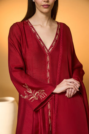Details: Kurta- A- line kurta is embellished with embroidered borders around the neckline and hem | 'V' neckline | Full sleeves adorned with gold motif embroidery and crochet scallop lace Pants- Red straight pants| All over screen printed "Forest Totem" | Side seam closure | Adorned with crochet scallop lace Dupatta- Placement screen print "Forest Totem" | Adorned with crochet laces and tassels