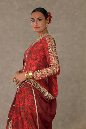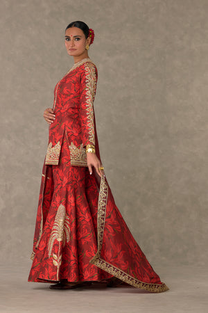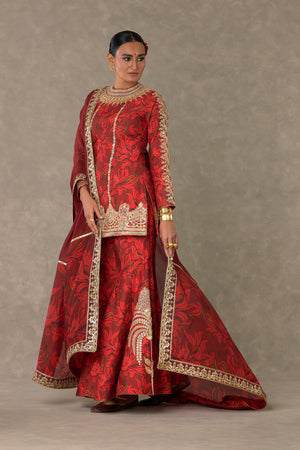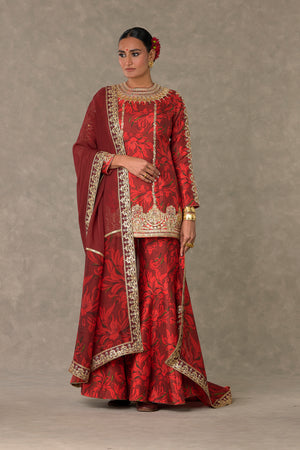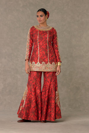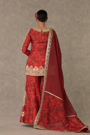 Details: Red Gulmohar Sharara Set - All over digital printed short kurta adorned with Haath-Phool and Kamal motifs in dori, sitara & dabka kaam| Full sleeves edged with kinari | Zero neckline with centre back closure along with side zip Sharara- All over digital printed Sharara adorned with Shajara motif in dori, sitara and dabka kaam dabka work and edged with kinari | Side zip closure Dupatta- Digital printed patchwork Organza dupatta embellished with with Haath-Phool border and edged with Kinari