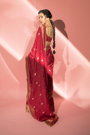 Details: Silk Red Saree, made with Jacquard silk fabric, comes with a Trikone and anar zari border. It is embellished with an embroidered border and edged with kinari. The blouse piece is silk and is also embellished with an embroidered border and gota silai