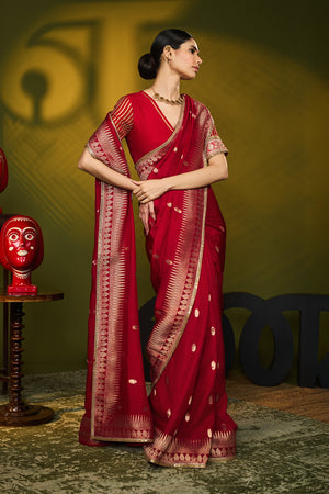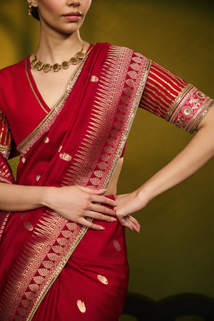 Details: Silk Red Saree, made with Jacquard silk fabric, comes with a Trikone and anar zari border. It is embellished with an embroidered border and edged with kinari. The blouse piece is silk and is also embellished with an embroidered border and gota silai