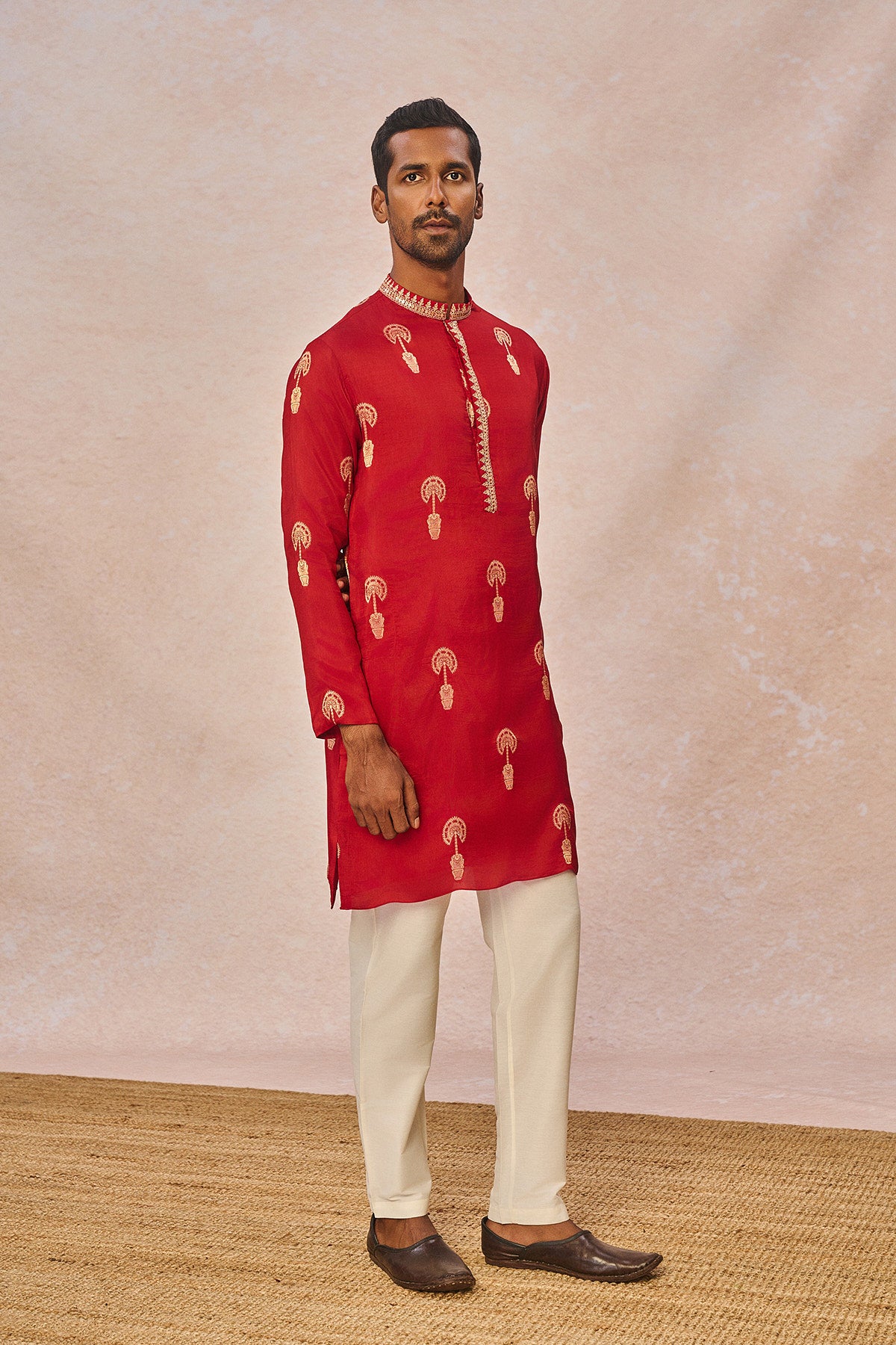 Details: Kurta- Beautiful jacquard fabric kurta | Full sleeves | Mandarin collar | Pocket detail | Concealed placket with gold embroidery Pant- Straight pants with pocket