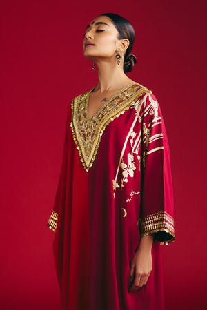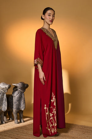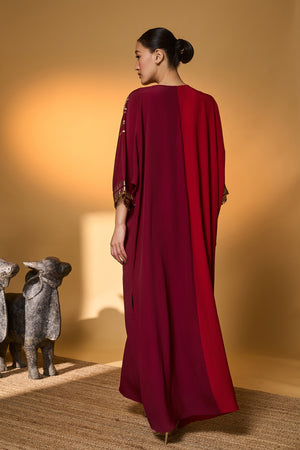 Details: A floor-length, relaxed-fit kaftan in a striking half-and-half color design. The silhouette is straight and fluid, offering an elegant and comfortable drape. An ornate V-shaped neckline features intricate gold embroidery for a regal touch. Sleeves are finished with matching embroidered borders with coin and foil detail for a cohesive look. A delicate gold foil floral motif is placed vertically with one side facing upward and the other downward, adding unique visual interest.
