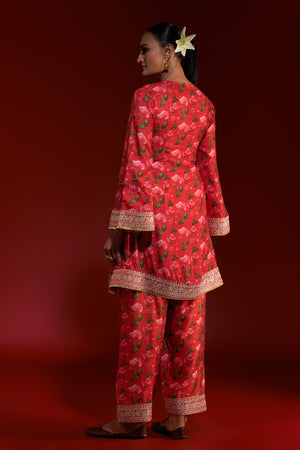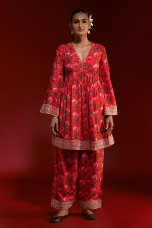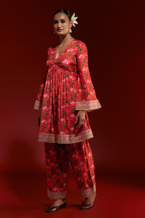 Details: Red Rain Lily Salwar Set - All over digital printed Kurta with gathers & hemline edged with embroidered border| Bell Sleeves with embroidered border | All over digital printed Salwar