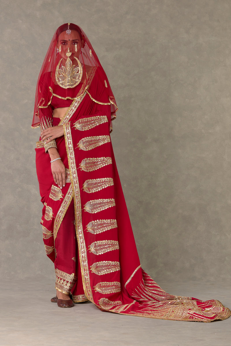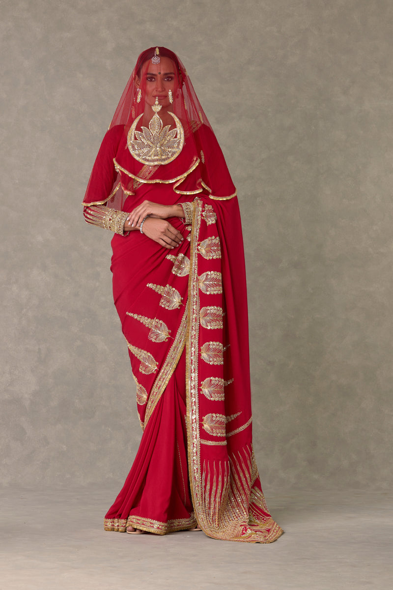 Details: Red Patti Saree - Palla intricately embroidered with signature motifs - Son-Patti, Son-Chidiya & Trikone in dori and sitara kaam |Embellished with embroidered borders | Printed backing Blouse piece - Trikone embroidered blouse piece Salwar - Gold foil printed patiala salwar with ornate borders at the hem | Centre back closure Veil - Sheer veil intricately embroidered with signature Chaand-Phool motif in sitara and pita kaam along with madakal finish