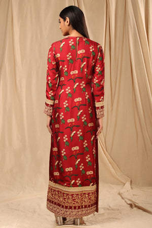 Details: Red Spring Blossom Kurta - Pick this Red Raw Silk long kurta with a high neck to dazzle at a special occasion! Adorned with aari embroidery and embellished with embroidered borders, the outfit features full sleeves and high slits and back opening. The kurta has contrasting front and Spring Blossom print at the back and comes with a Red Legging.